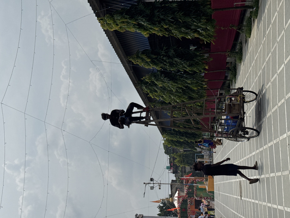 The image captures an outdoor scene near the Kalighat Temple in Kolkata, India, under an overcast sky. In the center, a young man, silhouetted, is seated on a stool at the apex of a tall, A-frame wooden ladder. He wears dark clothing, sunglasses on his head, and a facial covering, and is actively manipulating strings of decorative lights suspended overhead. The ladder is integrated into a three-wheeled handcart containing blue crates. In the foreground, another man, also silhouetted in dark attire, walks from left to right across a tiled ground surface composed of light gray squares. In the background to the left, a Hindu temple structure is visible, featuring an orange flag, a golden dome, and festive decorations including garlands and floral arches. To the right, a long building with a corrugated metal roof is fronted by a row of slender, tall evergreen trees and a red fabric barrier. Multiple indistinct figures are present in the distant background, indicating a public area.