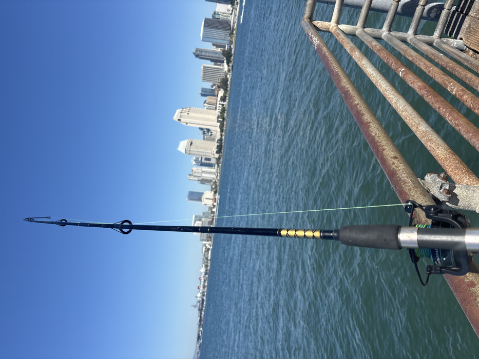 The image depicts a fishing scene from a pier located in Coronado, United States of America, overlooking San Diego Bay