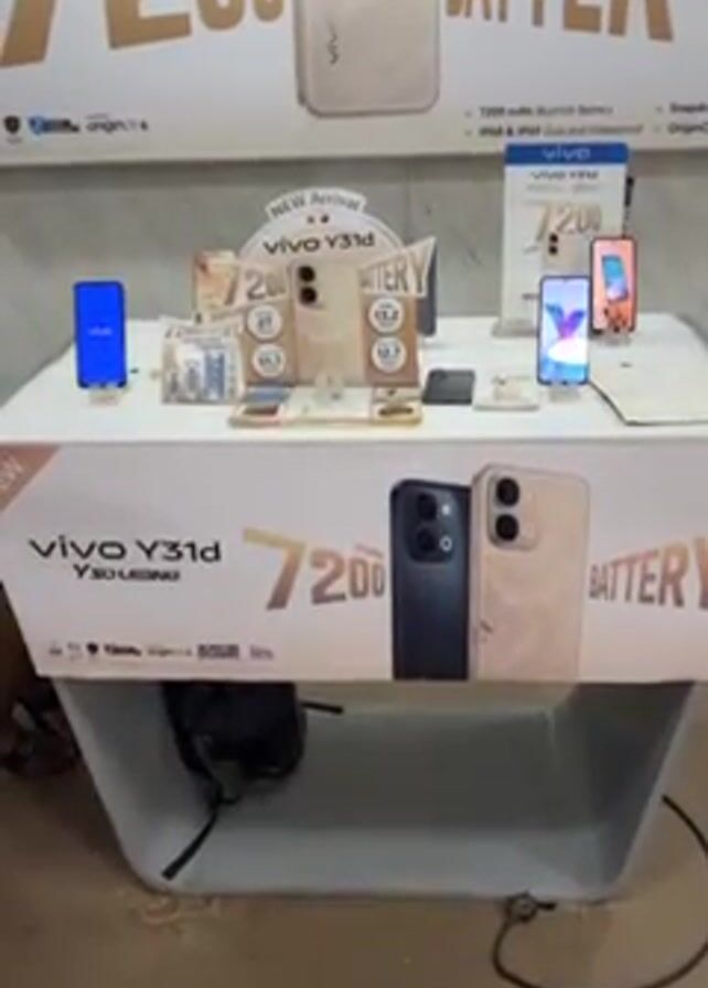 A display table featuring Vivo Y31d smartphones stands in what appears to be a retail environment