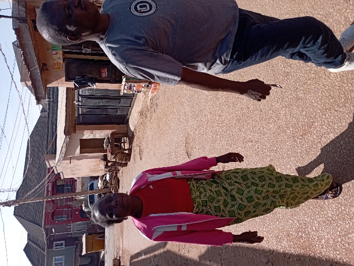 This daytime image depicts a street scene in Jos, Nigeria, under clear skies. Two individuals are walking on a light brown, granular-textured ground. On the left, an older adult female, wearing a red t-shirt, a pink and white zip-up jacket, a green patterned wrapper, and dark sandals, walks forward, looking directly towards the camera. On the right, a middle-aged male, dressed in a grey t-shirt with a white circular "UD" logo, dark blue jeans, and white sneakers, walks towards the right side of the frame, looking in that direction. He holds a small, dark, metallic object in his right hand. No direct interaction is observed between the two individuals. In the background, on the left, stands a multi-story building with a red and white facade and a dark shingled roof. Further back on the left, a yellow wooden container and part of a white vehicle are visible. On the right, a single-story light brown building with a corrugated metal roof features a dark metal gate and two small wooden tables outside, one displaying items in woven baskets and bottles. A utility pole with multiple overhead wires stands centrally in the background. Strong sunlight casts distinct shadows on the ground, indicating bright conditions.