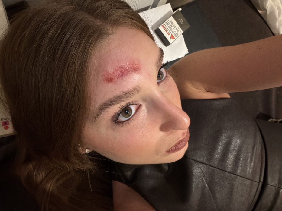 A female individual with brown hair and light brown eyes is depicted in a high-angle, close-up photograph, looking directly upward towards the camera. A distinct reddish abrasion, approximately 3-4 cm in length, is present on her forehead, positioned superior to the left eyebrow. She is wearing a dark-colored, possibly leather, sleeveless garment. A small, round stud earring is visible in her right earlobe. In the background, positioned to the right of her head, a partially visible white rectangular object displays a red warning triangle and Hebrew text, including "אזהרה" (Warning). Below this, "Carmel Wines" is printed in English. This object confirms the location as Israel. The scene is an indoor environment in Tel Aviv, Israel, illuminated by low ambient lighting. No active interactions or specific actions are depicted beyond the individual's gaze into the camera.