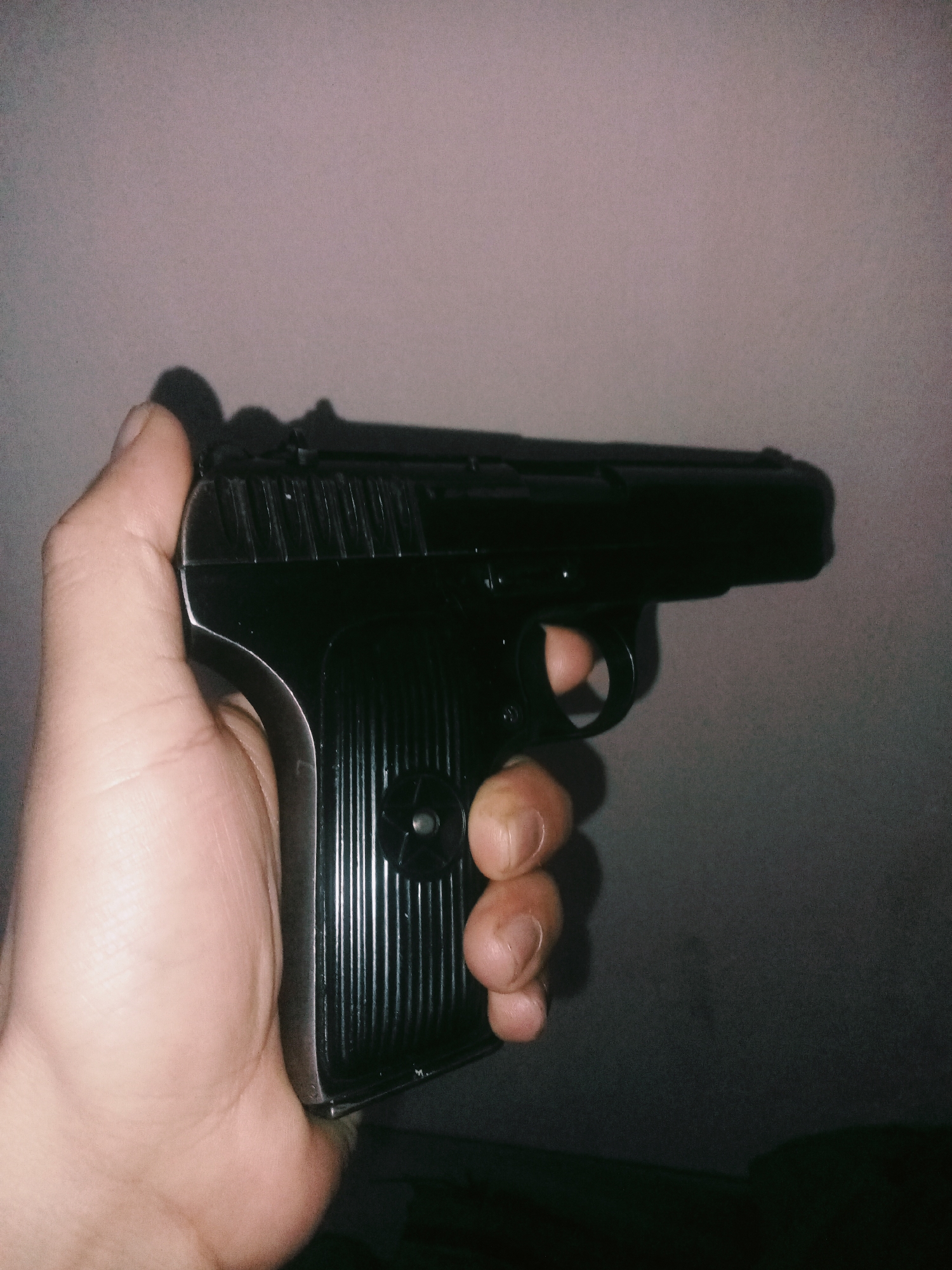 The image depicts a human hand holding a black semi-automatic pistol against a plain, light-colored background, consistent with an indoor setting in Mansehra, Pakistan. **Subject and Objects:** A pale-skinned human hand, likely an adult's, occupies the left side of the frame, gripping a black handgun. The thumb is positioned along the backstrap, while the fingers wrap around the ribbed pistol grip. The index finger is inserted into the trigger guard, resting in front of the trigger without making contact. The pistol is oriented with the barrel pointed towards the right, out of frame. The handgun features a black finish, a ribbed grip, and rear slide serrations. **Actions and Interactions:** The hand is holding the pistol in a firm, controlled manner. There are no other visible subjects or direct interactions. **Environment:** The background consists of a solid, light gray or off-white surface, likely a wall. Shadows are cast on this surface from the pistol and hand, suggesting a light source originating from the upper left. The lower right portion of the image is darker, possibly indicating a shadowed area of the room or another surface. The overall lighting is dim.
