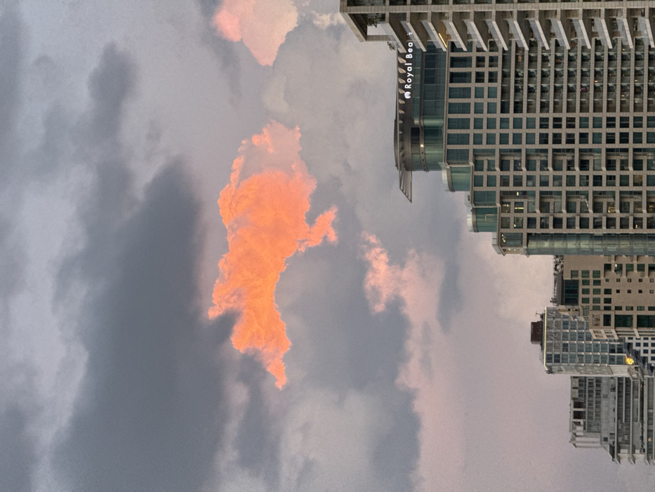 The image displays an urban skyline in Tel Aviv, Israel, under a cloudy sky at what appears to be either dawn or dusk. The lower half of the frame is occupied by several modern high-rise buildings. The most prominent building, located in the mid-right, is identified as the Royal Beach Hotel via partial visible signage "Royal Bea." This structure features a curved, multi-tiered design with a light teal-colored glass facade and a distinctive flat roof overhang. To its immediate right, a portion of a tall, white residential building with numerous balconies is visible. To the left of the Royal Beach Hotel, a series of other high-rise buildings are present, one of which shows partial signage "Hemp," indicative of the Hempton Tel Aviv hotel. The upper half of the image is dominated by an overcast sky. Dark grey clouds are interspersed with lighter grey and pink-hued clouds. A central, intensely illuminated cloud formation stands out in a vibrant orange-pink color, sharply contrasting with the darker clouds and exhibiting an elongated, irregular shape. There are no individuals, vehicles, or specific ground-level objects visible within the frame.