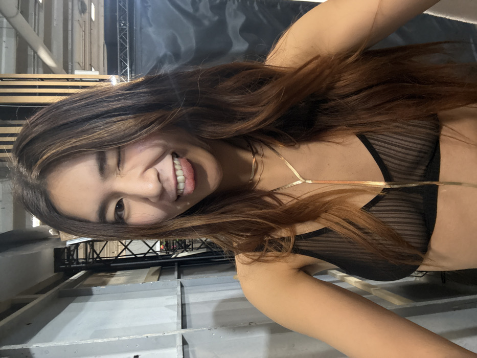 An indoor selfie depicts a young East Asian female from the chest up, positioned centrally