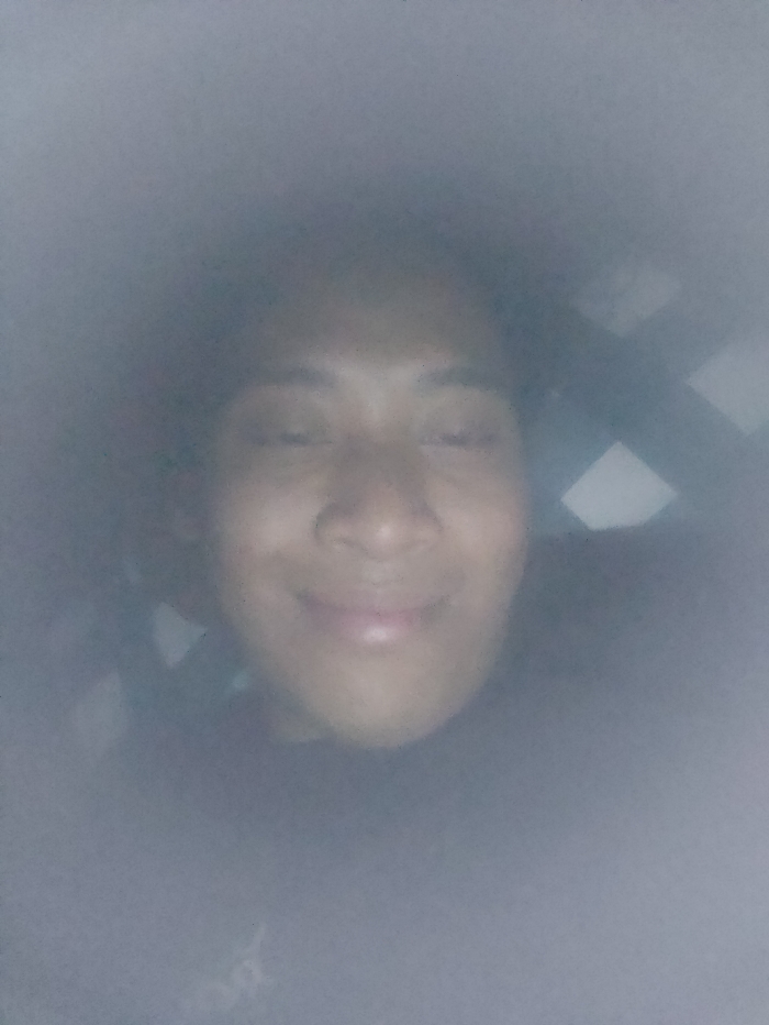 The image is a close-up of a person's face. The subject's eyes are closed, and their lips are slightly parted in a smile. The image is blurry and the person's face is obscured by a haze of smoke. The location is unknown, and the image does not provide any information about the surrounding environment.