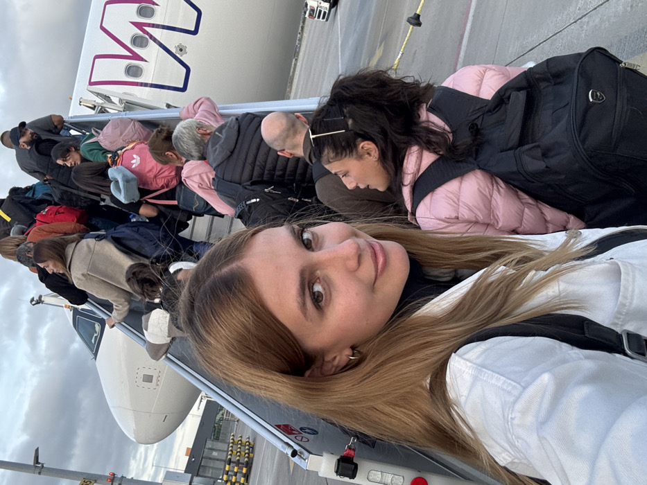 The image depicts a group of passengers boarding a white Wizz Air aircraft via mobile stairs on an airport tarmac at Charleroi Airport, Belgium. In the immediate foreground, a young adult female with light brown hair, wearing a white denim-style jacket over a black turtleneck and carrying a black backpack, smiles directly at the camera. Behind her, a queue of approximately 15-20 individuals ascends the gray metal stairs towards the aircraft's forward door. A female with dark hair, wearing a pink puffer jacket and a black backpack, is visible directly behind the foreground subject, looking to her right. Further up the stairs, a bald male in a black puffer vest and another female in a beige coat are part of the line. The aircraft's white fuselage displays a partial "WIZ" logo in purple. The scene is outdoors on an asphalt tarmac under an overcast sky, with airport infrastructure, including yellow and black safety bollards and a white truck, discernible in the background.