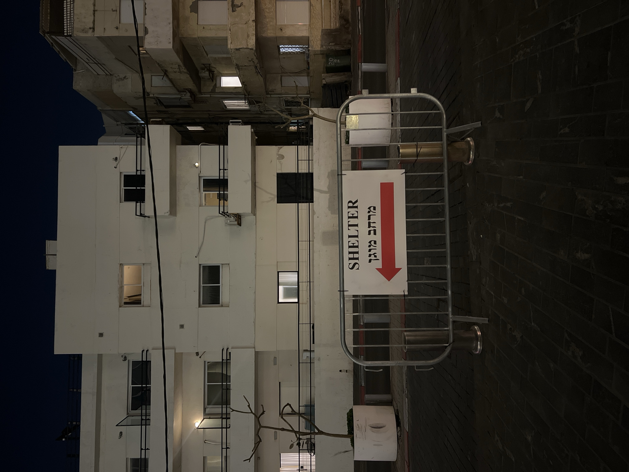 The image depicts a street scene in Tel Aviv, Israel, at night. The scene is dominated by two adjacent buildings. One is a white, multistory residential building with multiple windows. The other building is a darker, older structure. A metal barricade stands prominently in the foreground, with a sign attached that reads "Shelter" in English and Hebrew, indicating the direction towards a shelter. A small, leafless tree in a white pot is visible near the base of the barricade, and the ground is paved with dark bricks. The image is rotated counter-clockwise.