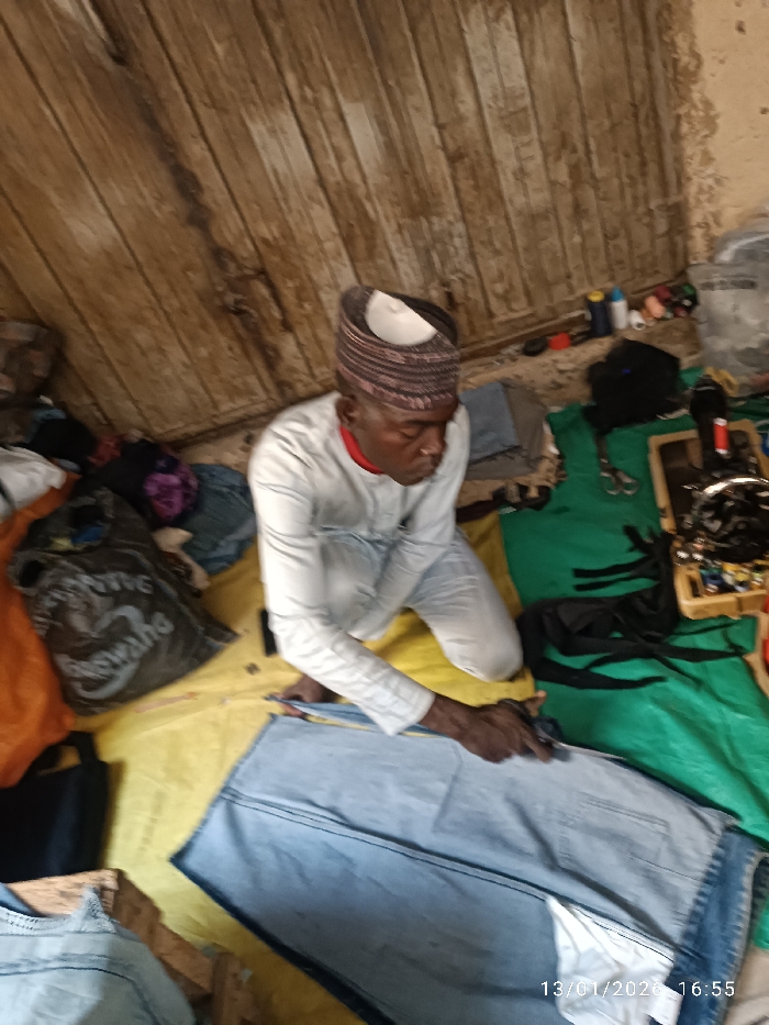 A man wearing a patterned kufi cap and a light-colored, long-sleeved shirt is kneeling indoors. He is using scissors to cut a pair of blue jeans laid out on a yellow surface. Various items such as fabric scraps, thread spools, a sewing kit, and a black bag are scattered around him. The space is enclosed by wooden walls or doors. A date stamp is visible in the bottom right corner: 13/01/2026.