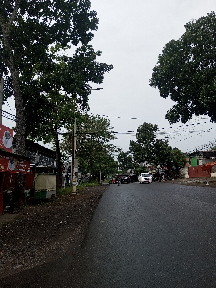 The image depicts a street scene in Kodarapalli, India, under an overcast sky. The foreground features a dark asphalt road, appearing damp, that curves gently to the right and recedes into the distance. To the immediate left of the road is an unpaved, dark ground shoulder composed of dirt and small stones. On the left side of the scene, a commercial structure with a red facade is visible, displaying multiple white circular signs with a coffee cup graphic and text, possibly "Hayya Ngopi Yuk". Adjacent to this, a light-colored mobile vendor cart with an awning is parked. Further back on the left, a multi-level building with a dark, open-air upper section or railing is partially discernible, obscured by foliage. Numerous mature trees with dense green canopies line both sides of the road, particularly prominent on the left, and extend throughout the background. Multiple utility poles and a network of overhead power lines are visible, stretching across the scene. In the mid-ground, vehicular traffic is present on the road. A white SUV, possibly a Toyota Innova, is visible, facing away from the viewer. Behind it, other darker vehicles and at least one motorcycle with a rider are also present, moving or stopped. Along the right side of the road, a series of low-rise buildings and structures, some with red and green painted elements, are distributed into the background. No specific human interactions or distinct pedestrian figures are clearly identifiable beyond the motorcycle rider.