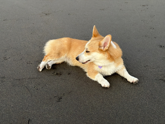 A corgi lies on a dark grey sandy beach
