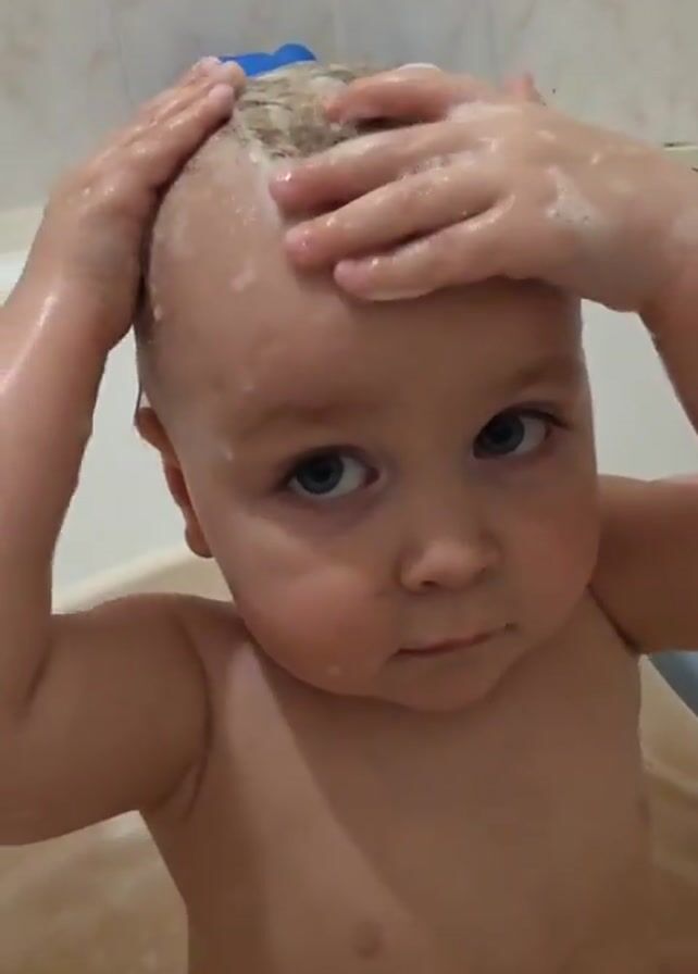 toddler in a bathtub, covered in soap. The toddler is fair-skinned with light brown or blonde hair. The toddler is looking down. They are in a bathtub filled with water and some bubbles. The bathtub is beige. The background consists of tiled walls, primarily white with some beige patterns. The toddler is rubbing their head and face with their hands. The water appears to be soapy.