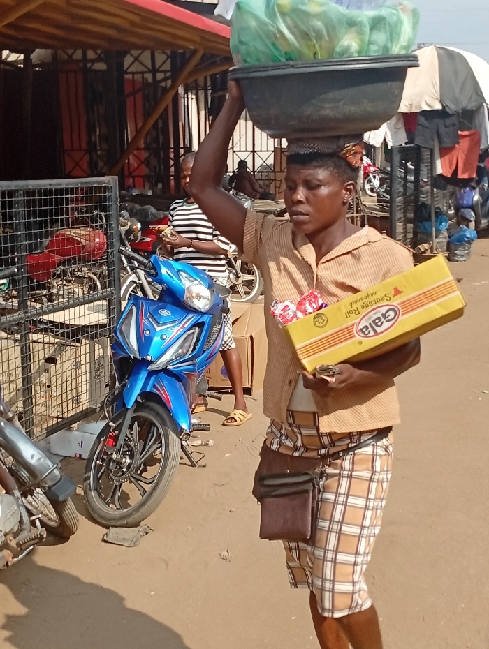 The scene captures an outdoor market in Nnewi, Nigeria, during daylight. A dark-skinned woman, positioned in the center-right foreground, walks forward with a focused expression, her gaze directed slightly to her left. She wears a light brown collared short-sleeved shirt and beige-and-white plaid shorts, with a dark brown waist pouch secured around her midsection. She expertly balances a large, dark-colored plastic basin, containing items within a green plastic bag, on her head, with her right arm raised to maintain stability. In her left hand, she holds a yellow cardboard box labeled "Gala Sausage Roll" and several smaller, red-and-white packaged items. To the woman's left, a bright blue motorcycle with black spoked wheels is parked on its kickstand on the unpaved dirt ground. In the mid-ground, behind the motorcycle and a metal gridded structure, another individual wearing a black-and-white striped shirt is partially visible, appearing to be standing or seated near additional parked motorcycles. The background consists of various market stalls, characterized by red awnings, metal framework, and visible merchandise, indicative of an active commercial area. The ground throughout the visible area is unpaved dirt or sand.