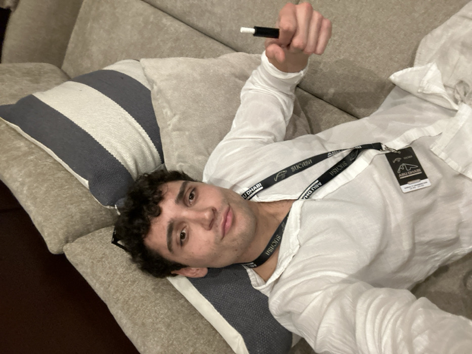 A male individual with dark, curly hair, wearing a loose-fitting white shirt, reclines on a light-colored sofa adorned with striped and plain throw pillows. He holds a small, black object with a white tip in his extended right hand. Sunglasses are perched on his head. A black lanyard hangs around his neck, displaying the text "SUCISA" and "ABU DHABI," alongside a logo resembling a motorsport circuit. An attached identification badge is partially visible, featuring the "ABU DHABI" text and the circuit logo. The individual looks directly into the camera with a slight smirk. The branding on the lanyard and badge indicates the location as Abu Dhabi, United Arab Emirates, specifically in connection with an event at or near the Yas Marina Circuit.
