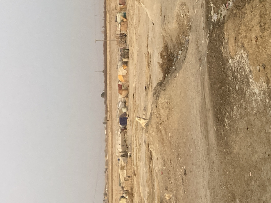 An outdoor scene in Kuchlak, Pakistan, depicts an arid, dusty environment under a hazy, light grey sky