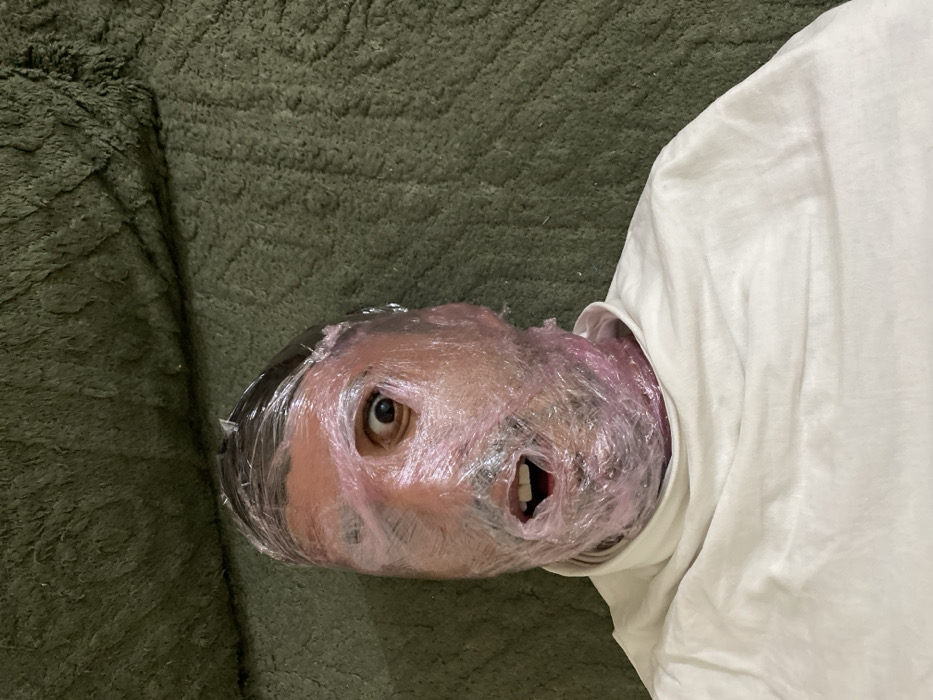 A person lies on a green, textured surface, possibly a rug or blanket. Their head is tightly wrapped in clear plastic wrap, with a visible eye and an open mouth. They are wearing a white shirt or top. The positioning and wrapping create a sense of discomfort and possible suffocation. The lighting is diffused, casting soft shadows on the face and clothing.