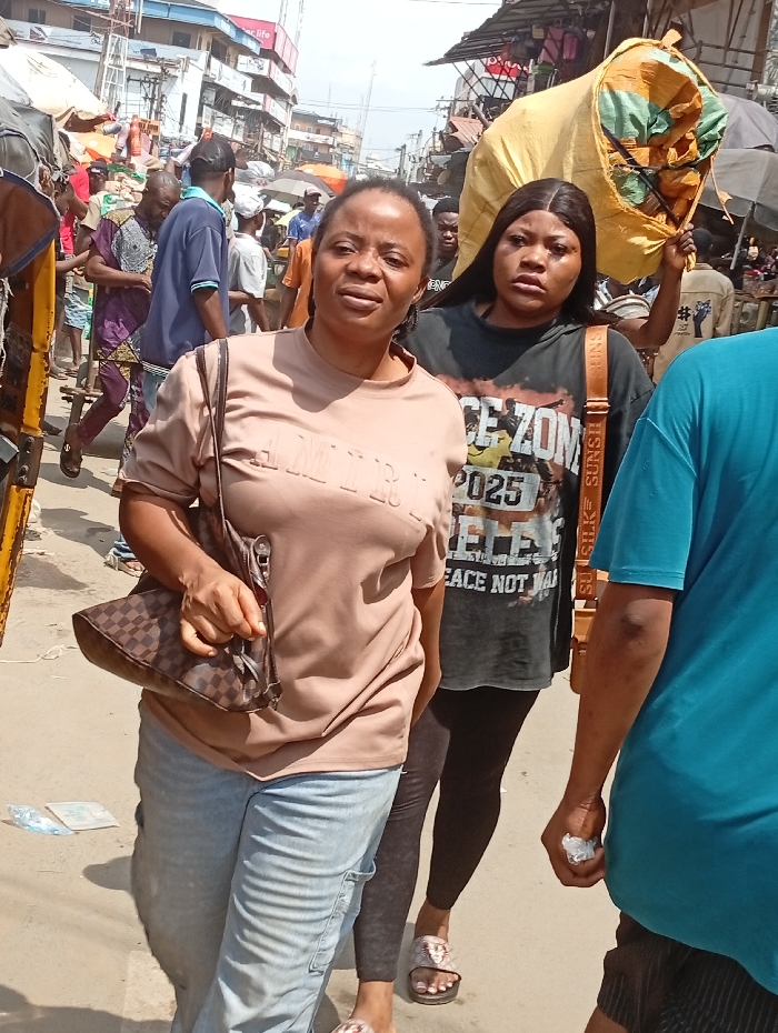 In a bustling street scene, two women are prominently featured. One wears a tan t-shirt and jeans, carrying a brown checkered bag. The other wears a black t-shirt with graphic text and black leggings. A large, bulging sack is carried on someone's head nearby. A diverse crowd of people fills the background, some wearing colorful clothing, creating a lively, crowded atmosphere. The environment suggests a marketplace or busy commercial area.