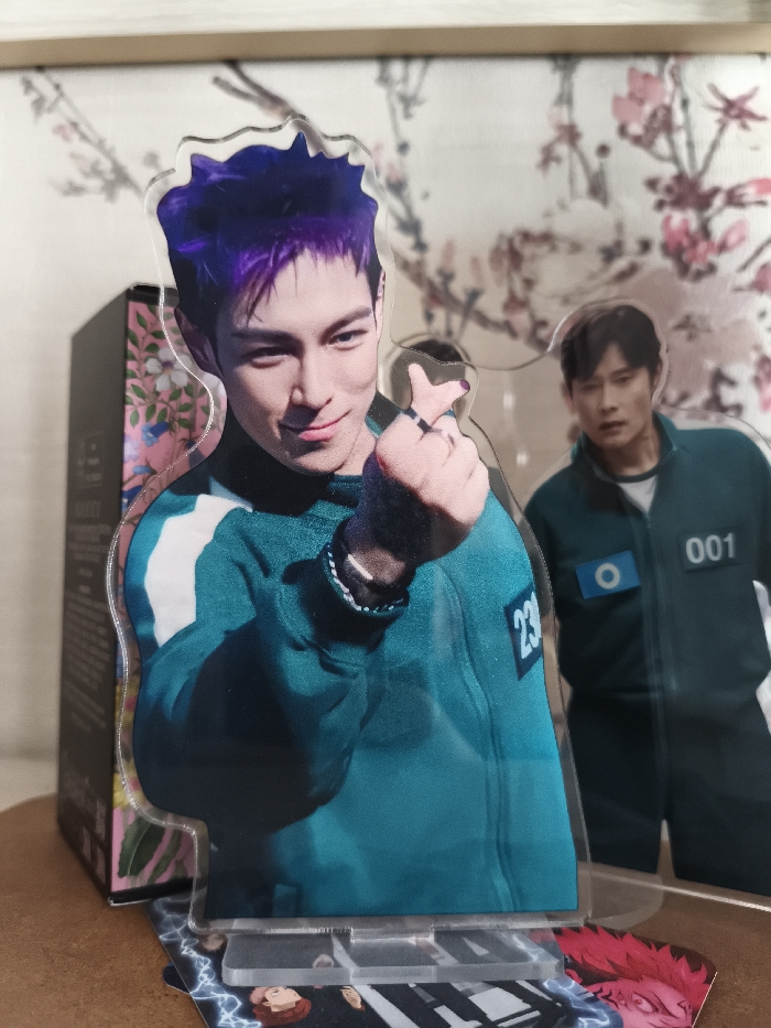 The image displays an indoor, close-up view of several acrylic standees and assorted merchandise arranged on a flat, brown, textured surface. In the immediate foreground, a clear acrylic standee features a male figure with bright purple, spiky hair. He wears a teal tracksuit top with white side stripes and a blue patch on the left chest area marked with "230". His right hand forms a finger heart gesture, revealing a ring on his index finger and a multi-beaded bracelet on his wrist, while he smiles towards the viewer. Behind and to the right of the primary standee, a second acrylic standee of another male figure is visible, slightly out of focus. This figure is clad in a dark green tracksuit, displaying a blue circular patch and the number "001" on his left chest. He is positioned looking towards the viewer's left. To the left of the foreground standee, a dark, rectangular box, possibly product packaging, with a distinct pink and white floral pattern, is partially visible and out of focus. Beneath the standees, resting on the brown surface, are several graphic prints or cards, including depictions of characters with red and brown hair, and lightning bolt imagery. The background consists of a light-colored surface, likely fabric or wallpaper, decorated with a pattern of dark branches adorned with multiple pink blossoms. A light wooden frame segment is visible at the top edge of this background element. The specific location within Kurovskoye, Russia, cannot be determined from the provided visual information.