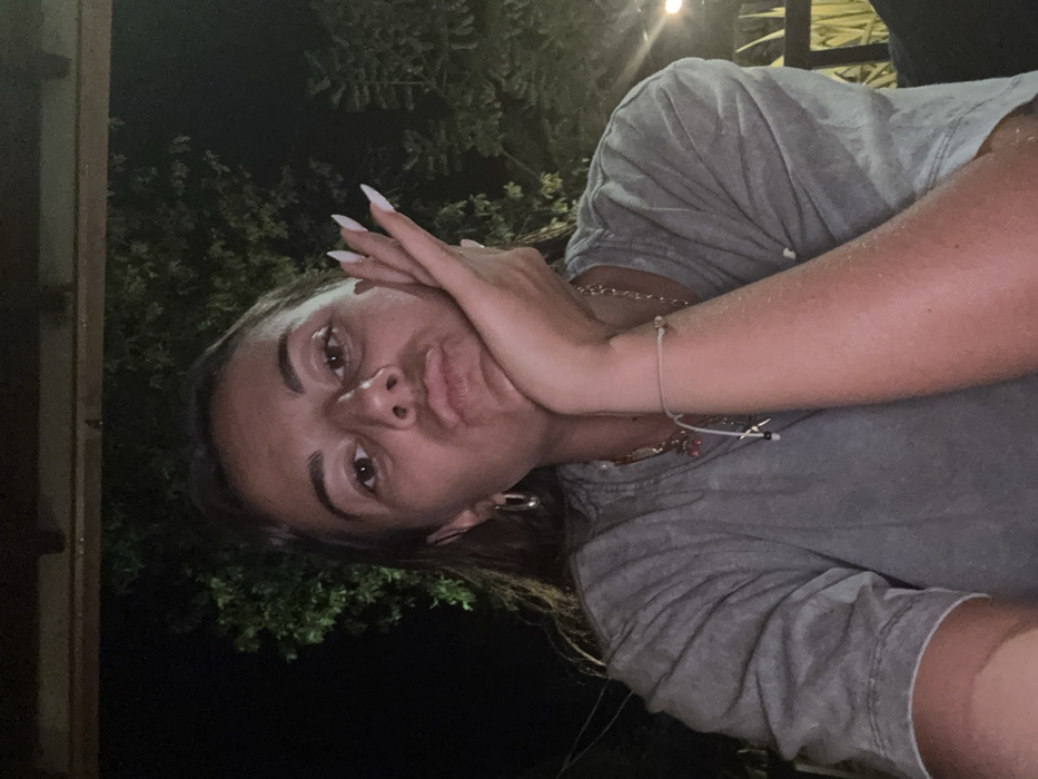 A female subject is depicted in a close-up, chest-up portrait, taken at night in Nilwella, Sri Lanka. She has medium-brown hair, light skin, and her lips are pursed. Her right hand supports her chin, with fingers extended upwards. She has long, pointed, white fingernails. The subject wears a grey t-shirt, silver-colored oval hoop earrings, a gold-colored chain necklace with multiple pendants (one red), and two bracelets on her right wrist: one a thin, light-colored string and another with a dark charm. The background is dark, showing blurred green foliage, an artificial light source on the lower right, and a dark wooden beam running horizontally across the top of the frame.