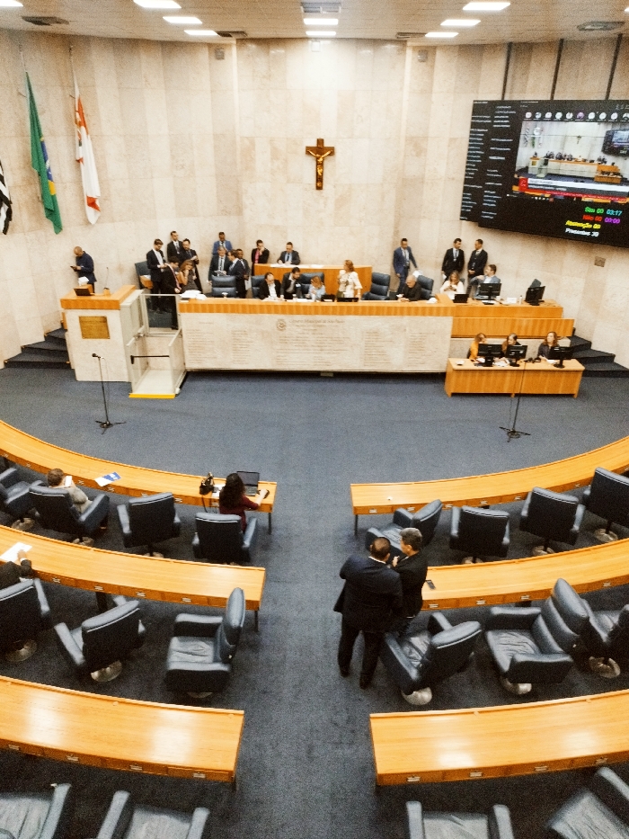 The photo showcases a room likely used as a legislative chamber or assembly. Rows of desks with leather chairs surround a central area. Behind the desks is a raised platform with more seating. A monitor displays what seems to be proceedings. Flags hang to the left of the platform, and a large cross is centered behind the platform. Several individuals are present, most wearing suits. The room's lighting is bright, and the overall impression is one of formality and importance.
