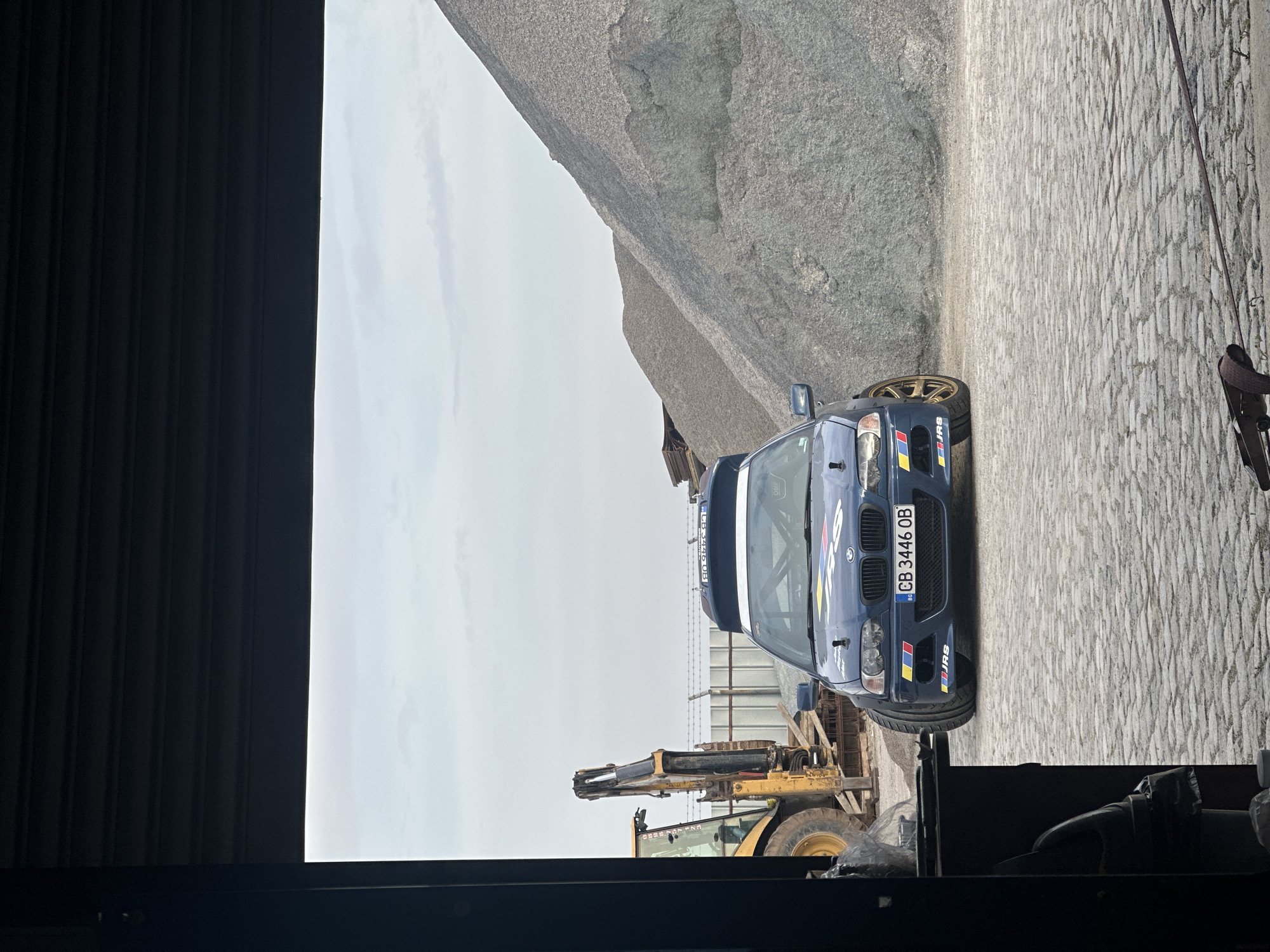 A blue BMW rally car with license plate CB 3446 OB is parked on a cobblestone surface. Behind the car is a large pile of gravel and a yellow bulldozer. The car is viewed from inside a dark, possibly industrial building, in Negovan, Bulgaria.