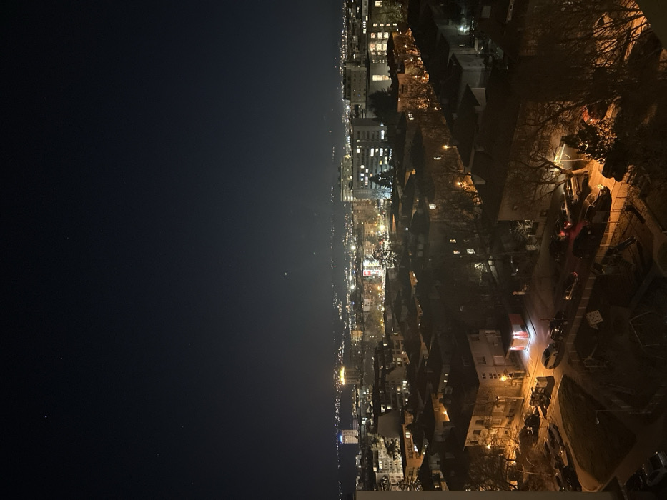 This image depicts a nighttime panoramic view of the city of Varna, Bulgaria, observed from an elevated vantage point overlooking the urban landscape towards the Black Sea. The upper portion of the frame features a dark, clear night sky dotted with several faint stars. The mid-ground reveals a dense urban environment characterized by numerous illuminated multi-story buildings, indicative of both residential and commercial areas. On the far left horizon, a body of water, consistent with the Black Sea, is visible. A prominent, tall, illuminated skyscraper-type building, resembling the Hotel Cherno More landmark, stands distinctly on the left side near the coastline. City lights stretch across the entire horizon, with distant hills faintly discernible beyond the urban glow. The foreground showcases a residential district with 3-5 story buildings, many exhibiting illuminated windows. Streets traverse this area, populated with numerous parked vehicles, including cars and vans. Bare deciduous trees are interspersed among the structures and along the streets. A brightly lit, rectangular, red-paneled kiosk or small commercial establishment is notably positioned at a street corner in the lower-middle left, emitting a strong orange light onto the adjacent pavement. Below this street and residential block, a dimly lit area contains discernible playground equipment. No human figures are visible in the scene.