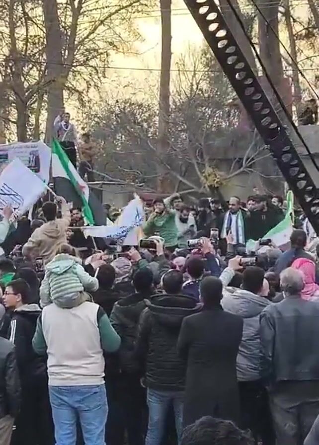 A medium shot shows a large crowd outdoors. The crowd is holding flags, including a Syrian flag and a white flag with Arabic script. Some people are filming or photographing the scene with their phones. A man in a green shirt is being lifted up by the crowd. A child is sitting on someone's shoulders. A black metal crane structure is visible in the foreground. The background consists of trees and buildings. The sky is overcast.