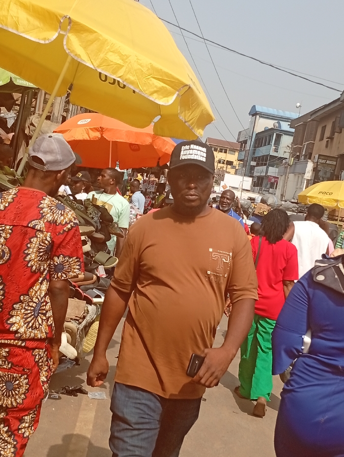 This image depicts a bustling open-air market scene in Nkwelle, Nigeria. In the foreground, a man walks directly towards the viewer. He wears a brown short-sleeved t-shirt with a geometric design on the left chest, blue denim jeans, and a black baseball cap with "Eric Nnaemeka Anyamene Foundation" printed in white text. He holds a dark-colored smartphone in his right hand, angled towards his side. To his immediate left, partially visible, another individual walks away from the camera, dressed in a red and white patterned traditional outfit and a grey baseball cap. The market environment is characterized by numerous large parasols providing shade; two prominent yellow parasols dominate the upper frame, along with an orange one visible beneath them. Various merchandise, including what appears to be footwear, is displayed on ground-level stalls to the left and extending into the midground. Several other individuals are present throughout the scene, walking among the stalls. One person to the right of the central figure wears a red top and a green skirt, while another wears a blue garment. In the background, multiple multi-story buildings, some with painted blue sections, line the street. Overhead, utility lines crisscross against a clear, bright sky. Visible signage includes "POS" on a stall and "POCO" on a yellow parasol in the far right background. The overall scene is brightly lit by natural sunlight.