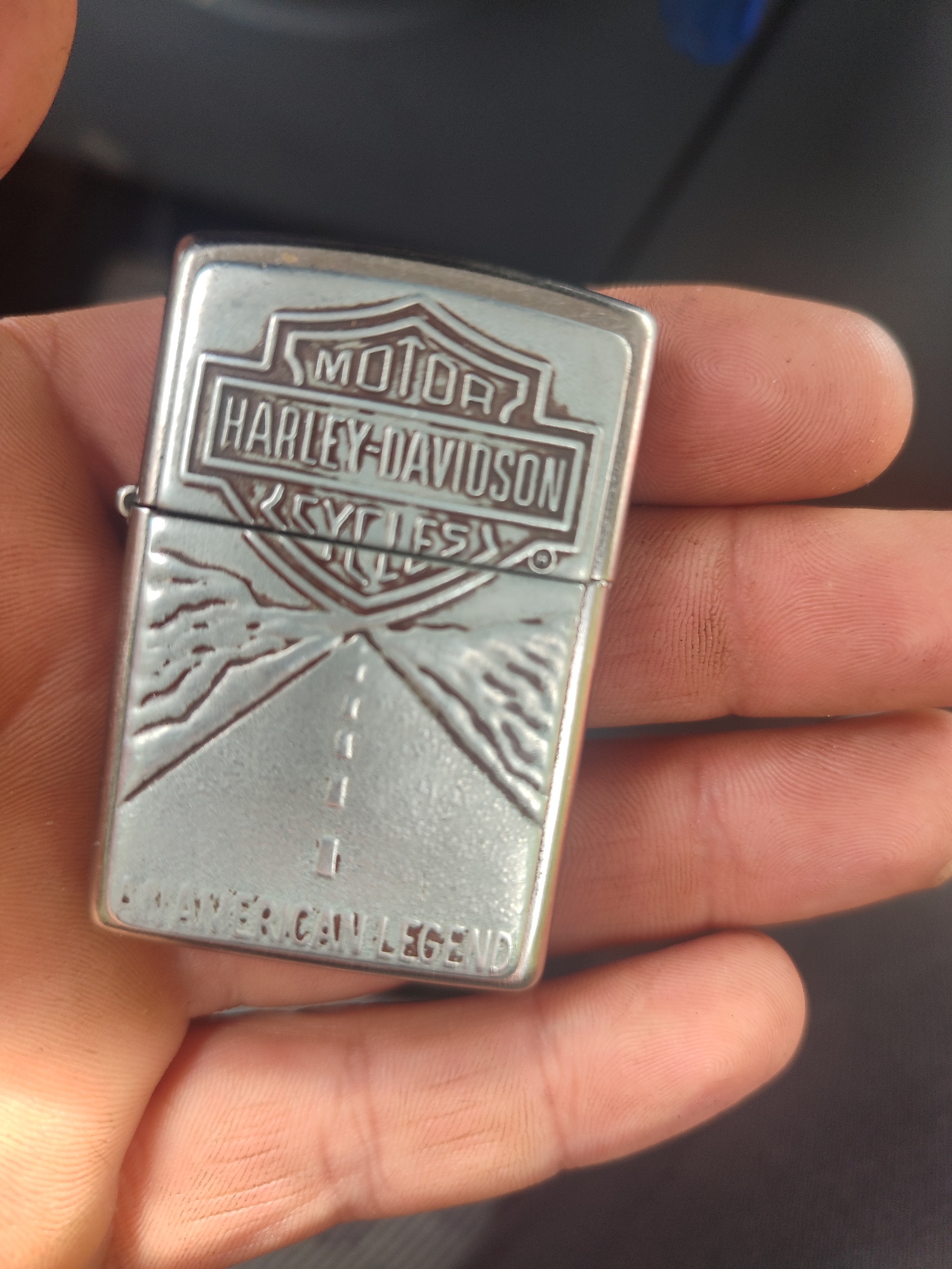 A silver Zippo lighter emblazoned with a Harley-Davidson logo is held in someone's hand
