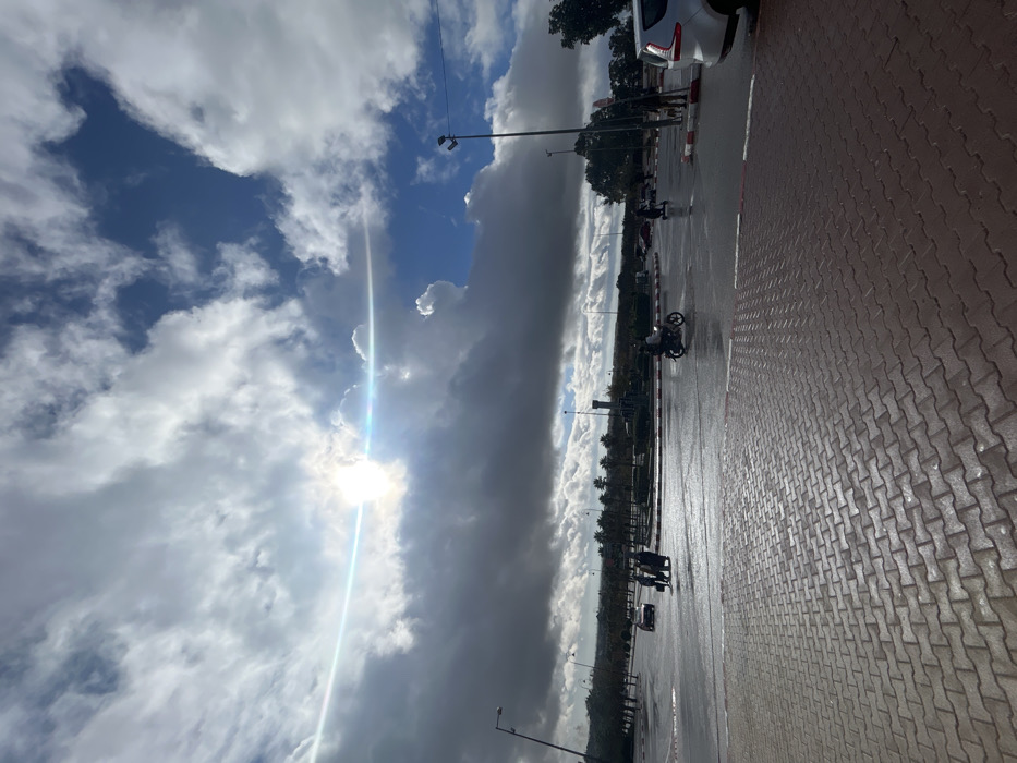 The image captures a wide-angle view of the Bab Fetouh roundabout (Place Bab Ftouh) in Fez, Morocco, under a sky with significant cumulus and stratocumulus cloud cover. The sun is visible and bright in the upper-left quadrant, producing a distinct horizontal lens flare. The foreground consists of wet, reddish interlocking pavers that reflect light, indicating recent rainfall. The road surface of the roundabout is also wet. In the mid-ground, a multi-lane roundabout is present, encircling a large central island. This island is landscaped with numerous palm trees and features a central monument or sculpture. On the left side of the roundabout, three pedestrians are grouped together, crossing one of the road lanes from left to right. A dark-colored sedan is visible further back in the roundabout. Near the center, a motorcycle with a single, helmeted rider is in motion, traveling from left to right across the frame. Another smaller motorcycle or scooter is visible further into the roundabout. On the far right, the rear portion of a silver-colored sedan is parked alongside a red and white painted curb. A solitary figure stands near this parked vehicle, adjacent to a tall streetlight. Another tall streetlight is visible on the far left. The background features distant rolling hills and a horizon lined with additional trees and vegetation under a mixture of dark and lighter clouds.