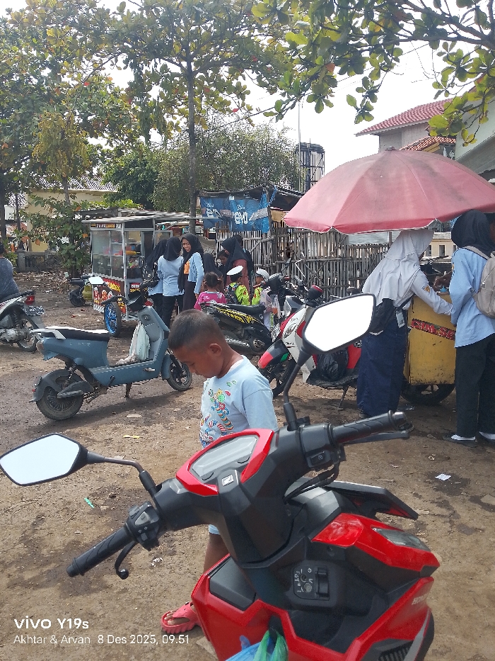 A bustling outdoor scene shows a young boy standing near a red Honda motorcycle, its mirror prominently displayed. Nearby, schoolgirls in blue shirts and hijabs gather near a food vendor's cart sheltered by a red umbrella. Various motorcycles and an electric scooter are parked around, adding to the lively atmosphere. Other children and adults mingle in the background, suggesting a busy local market or school setting.