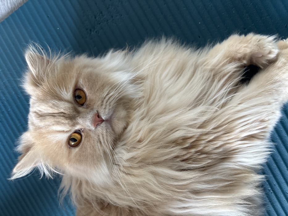 - "A cream-colored, long-haired domestic cat is depicted lying on a ribbed, dark teal-blue mat in Valkosel, Bulgaria" by FM-VjBKw1, licensed under CC BY 4.0