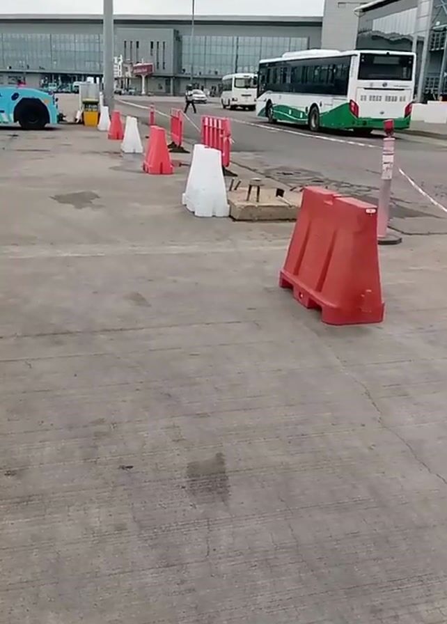 The camera shows a paved area at an airport with construction barriers, airport vehicles, and a bus in the background