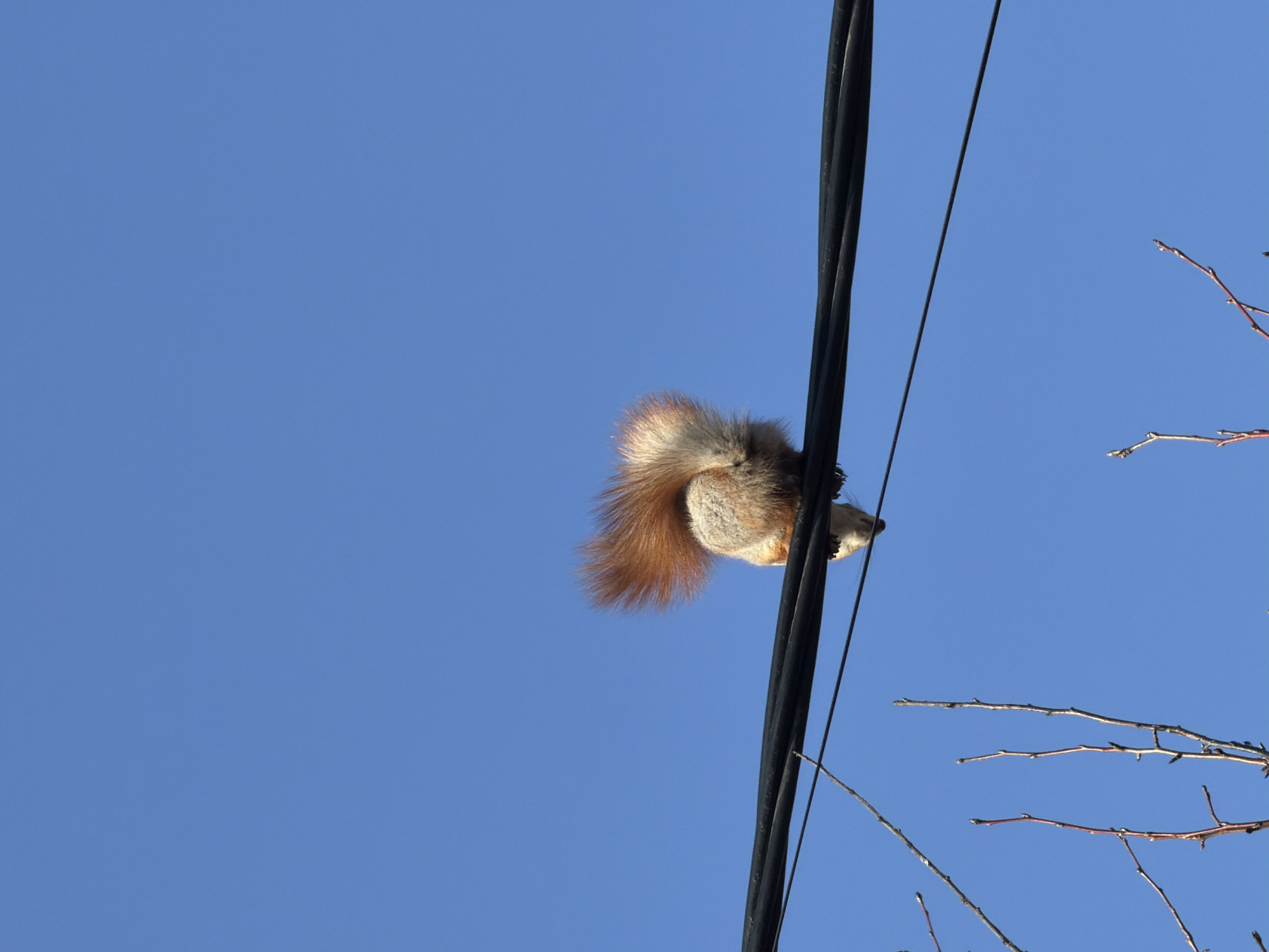 - "A reddish-brown squirrel with a prominent bushy tail and lighter ventral fur is observed from behind and above, positioned on a bundle of black electrical wires" by FM-dhy2S2, licensed under CC BY 4.0