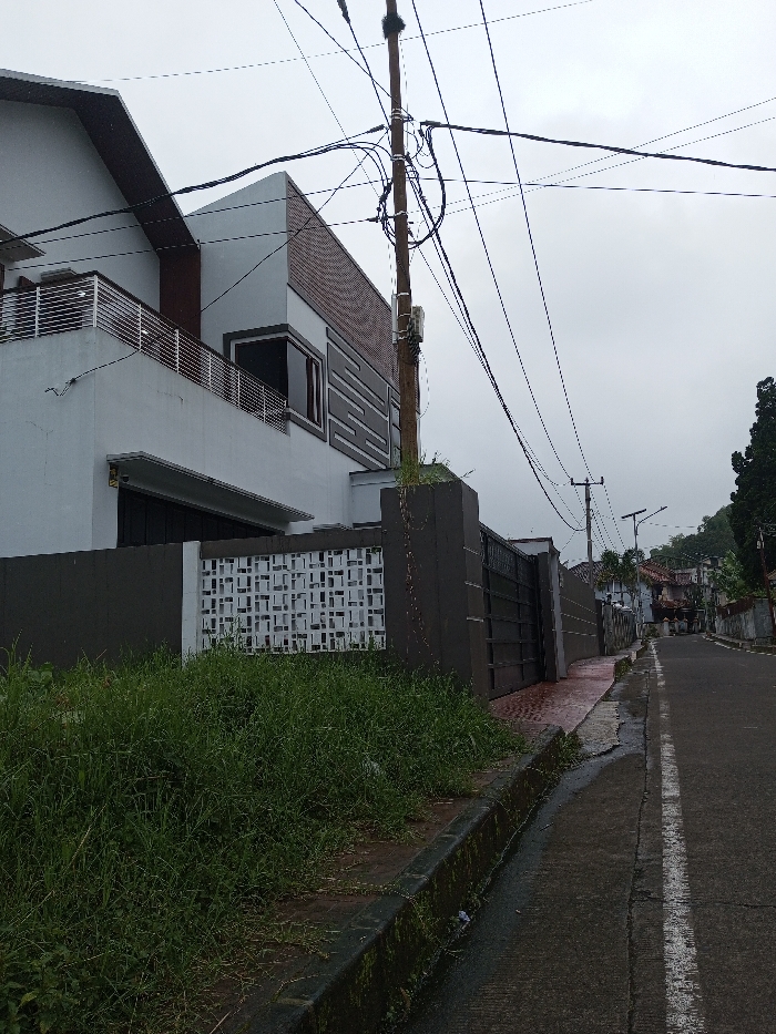 A modern, multi-level house with white and brown facades stands behind a dark gray fence with a patterned white section. Lush green grass grows wildly along the curb. A utility pole with numerous wires dominates the view. A narrow paved street with a white line marker stretches into the distance, lined with houses and greenery under an overcast sky.