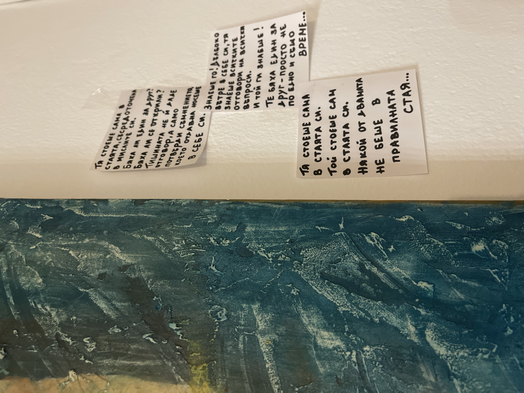 Here's a detailed description of the image: The image shows a section of a wall, with a painting visible at the bottom and three pieces of paper taped above it. The papers are all handwritten in what appears to be Bulgarian. The handwriting is in black ink, and the paper is white. The painting at the bottom is abstract, featuring shades of blue, white, and possibly hints of yellow. It has a heavily textured surface. The papers appear to contain text, possibly poems or prose fragments: * **Paper 1 (left):** Begins with "ТЯ СТОЕШЕ САМА В СТАЯТА, СЪСРЕДОТОЧЕНА В МИСЛИТЕ СИ..." (She was standing alone in the room, focused in her thoughts). * **Paper 2 (middle):** Starts with "ЗНАЕШЕ ГО! ДЪЛБОКО ВЪТРЕ В СЕБЕ СИ, тя ЗНАЕШЕ ВСИЧКИТЕ..." (She knew it! Deep inside herself, she knew all...) * **Paper 3 (right):** Has the lines "ТЯ СТОЕШЕ САМА В СТАЯТА СИ..." (She was standing alone in her room), and ends with "СТАЯ..." (room...). The wall behind the painting and papers is white. The overall composition suggests an artistic display or an expression of personal thoughts. There is no information that this is in Burgas, Bulgaria.