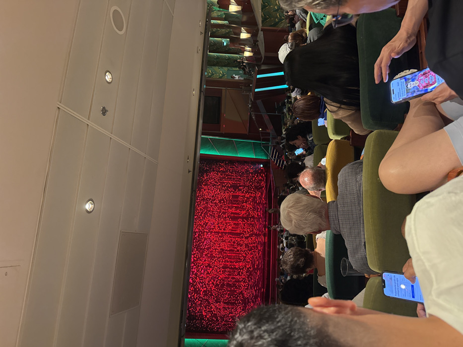 Inside a theater, many people are seated in green velvet chairs. The stage is illuminated with red lights and surrounded by green trim. Some audience members are looking at their phones, while others are watching the stage. The lighting and decor give the space a luxurious feel.