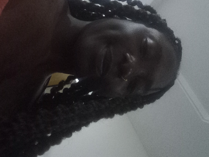 An upward angle captures a woman with dark skin and braids. She has a piercing on her nose. The background shows a white wall. The image is dimly lit, obscuring the details of her face and hair.