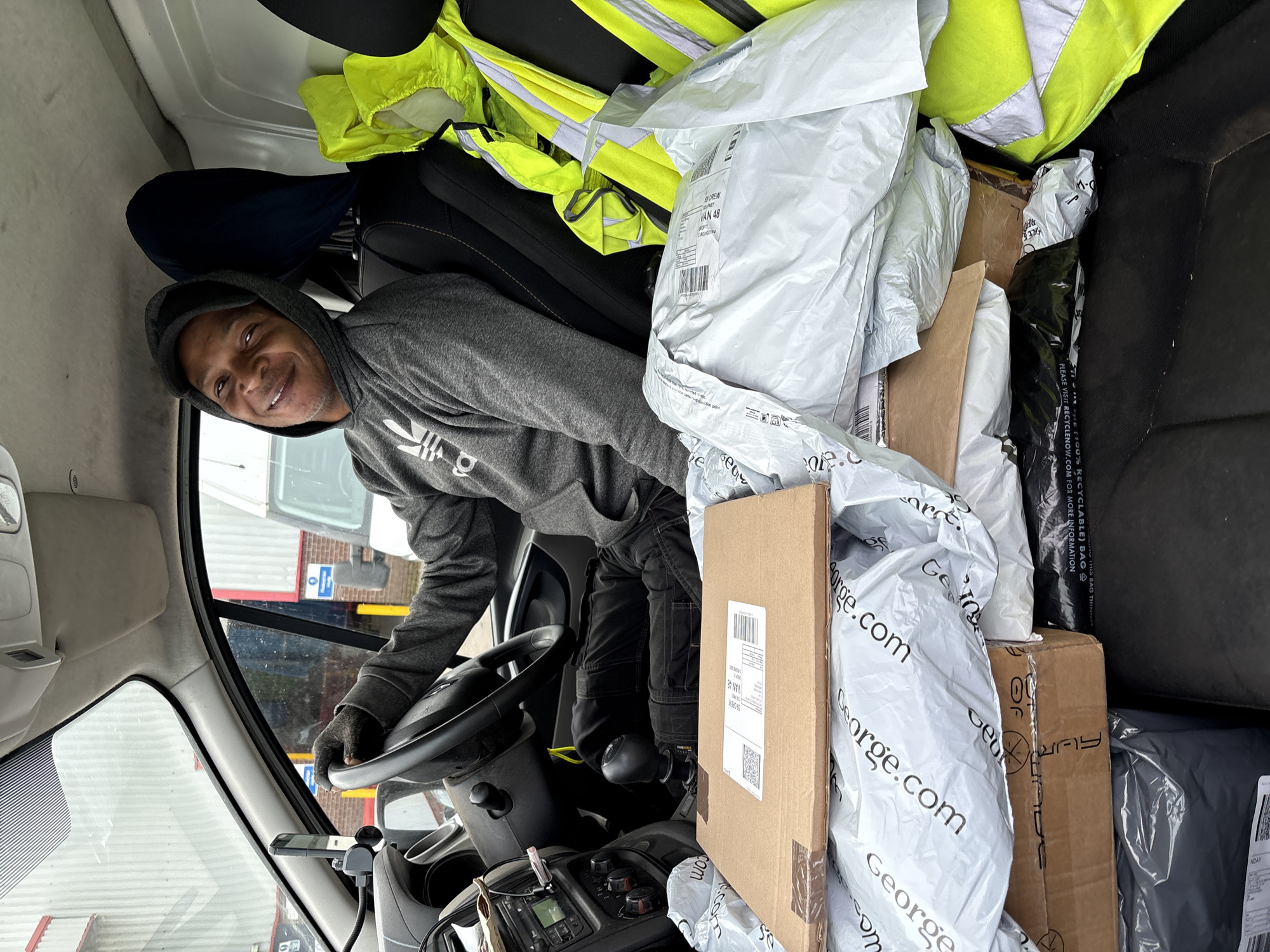 An adult male of Black ethnicity is seated in the driver's seat of a white commercial delivery van, which is a right-hand drive vehicle. He wears a grey hooded sweatshirt featuring an Adidas logo, black cargo trousers, and dark gloves, with a black cap visible beneath his raised hood. He is smiling and looking directly towards the camera, with his left hand resting on the steering wheel. The passenger seat and adjacent floor area are heavily loaded with numerous parcels. These include various brown cardboard boxes and white plastic mailing bags, many displaying the "George.com" logo. A bright yellow high-visibility vest with reflective strips is draped over the front passenger seat. A mobile phone mount is affixed to the dashboard near the windshield. Through the windshield, an exterior scene depicts an industrial or commercial building with light-colored corrugated metal siding and red trim. Another white delivery van is visible in the background, along with yellow bollards and blue informational signs. Partial text on a parcel label indicates "SHREWS", identifying the location as Shrewsbury, United Kingdom.