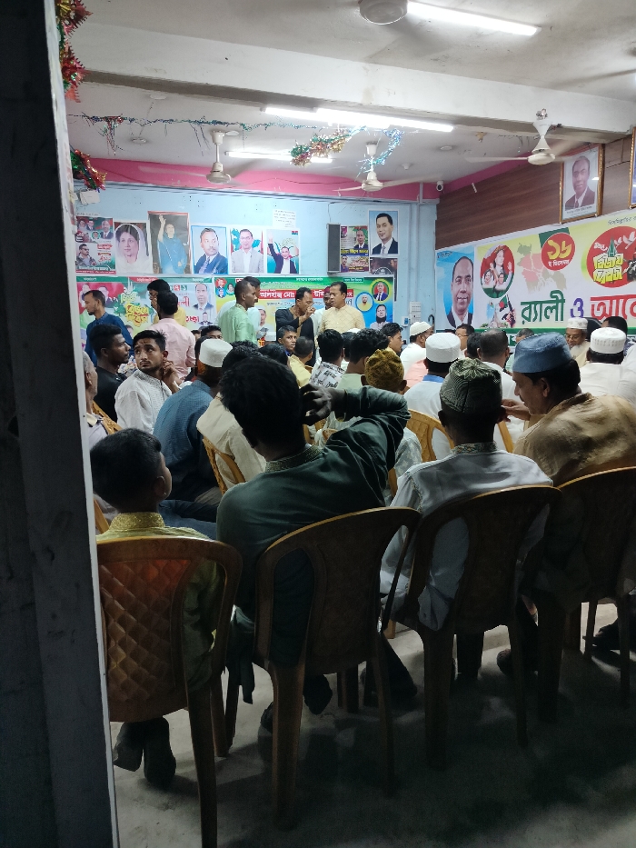 The image captures a gathering of men in a building located in Charfasson Sadar, Bangladesh (latitude: 22.187, longitude: 90.76). The men are seated on plastic chairs in rows facing a wall adorned with posters featuring political figures and slogans written in Bengali. The posters are visible throughout the room, creating a backdrop to the event. The walls are painted in a light blue color. The men are primarily dressed in traditional Bangladeshi attire, with many wearing white shirts and pants. The environment appears to be an indoor space, possibly a meeting room or a community center.
