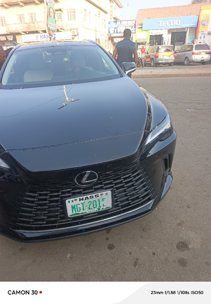 black Lexus car parked on a street. The car's license plate reads "NASS MGT-201". Reflections can be seen on the car's hood. A man in a sleeveless shirt walks on the sidewalk behind the car, and other vehicles are visible further down the street. Buildings and storefronts, including one for "TECNO," line the background. The photo was taken with a CAMON 30 camera, using a 23mm lens at f/1.88, 1/108s shutter speed, and ISO 50.