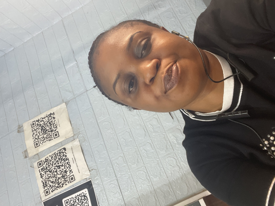 This image depicts a Black female individual from mid-face to upper chest, situated in an interior setting in Kubwa, Nigeria