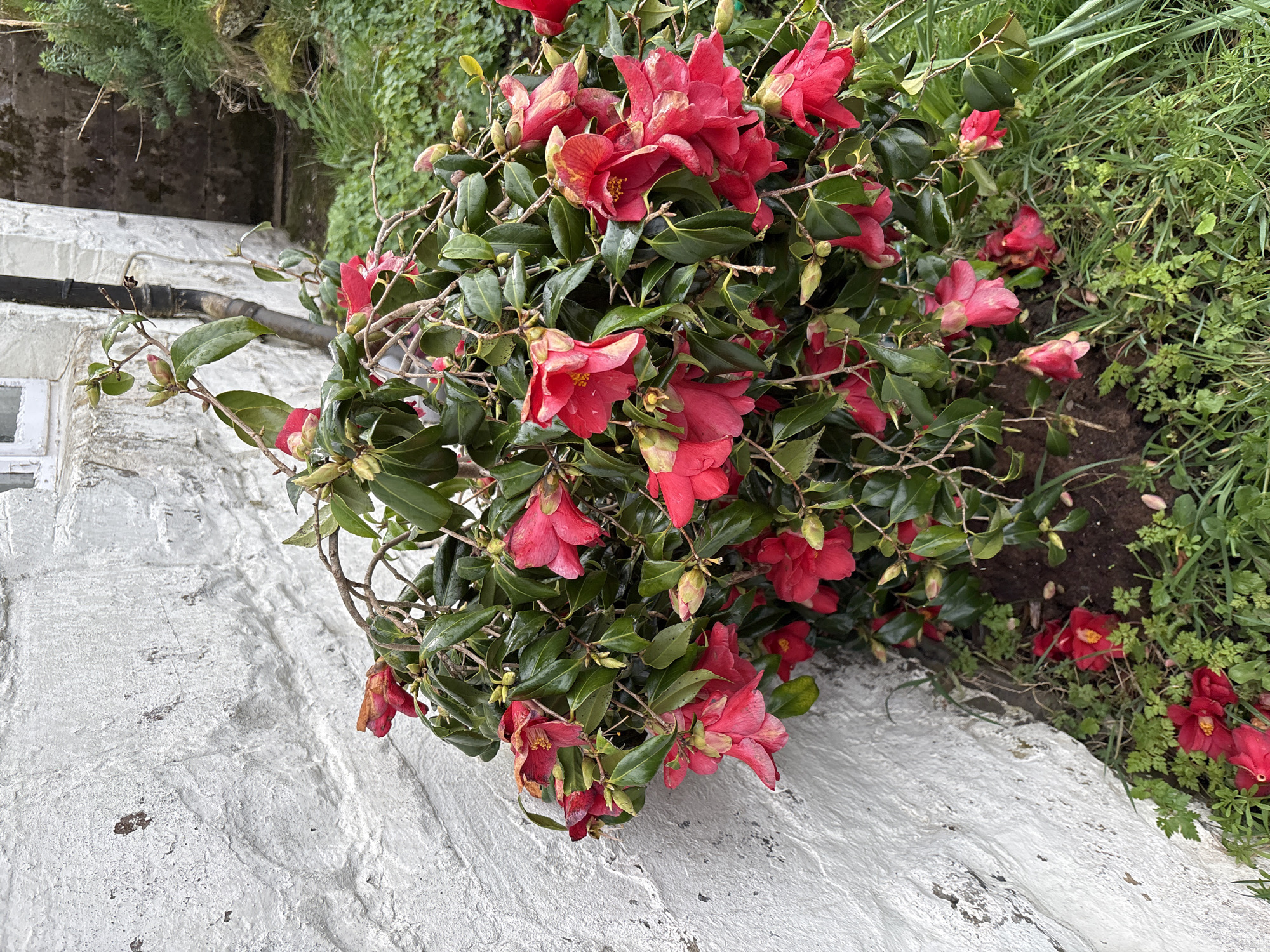 close-up of a flowering bush with vibrant red flowers and dark green leaves. The bush appears to be growing at the edge of a white painted brick or stone wall. To the right of the bush, there is soil and grassy vegetation. A pipe runs along the wall next to the bush. The location is in Shrewsbury, United Kingdom.