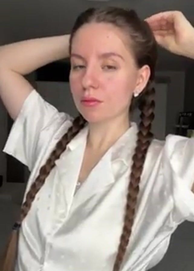 . The video shows a woman in a white button-up shirt with two braids. She is standing in what appears to be an indoor setting. She has her hair pulled back into two braids. The lighting is good, and the background shows parts of a room with a modern-looking light fixture on the ceiling. The woman looks directly at the camera, adjusts her braids, and then briefly makes a kissing face.