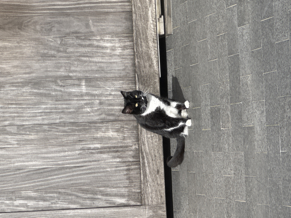 - "A black and white tuxedo cat is seated on dark grey rectangular paving stones in the city of Roeselare, Belgium" by FM-OzukK2, licensed under CC BY 4.0