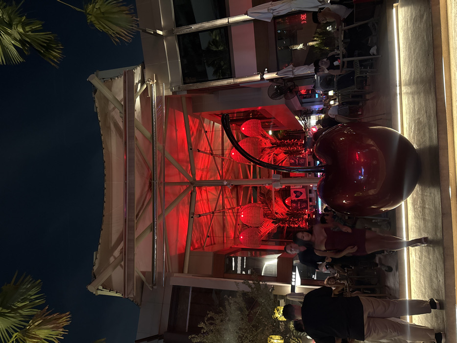 This image captures a lively outdoor commercial and dining area at night, specifically located at The Commons Thonglor in Bangkok, Thailand. The scene is dominated by a large, glossy, dark red sculpture of a single cherry with a black stem, positioned centrally in the foreground on a raised concrete platform. Above and behind the cherry, a wide, open-air structure is intensely illuminated with red light, emanating from a canopy supported by visible beams. Multiple basket-weave light fixtures hang from this red-lit canopy. Several individuals are present. In the immediate foreground, a male subject seen from behind, wearing a dark t-shirt and light pants, stands on the platform to the left. A female subject in a dark red strapless dress and high heels walks towards the viewer, to the left of the cherry. Behind her, another male subject walks in the same direction, wearing a dark shirt. Further into the background, numerous people are seated at outdoor tables with light-colored chairs, engaged in dining or socializing. Some tables are partially covered by white patio umbrellas. To the right, a multi-story building features large glass windows reflecting ambient light. An outdoor fan is mounted on a support pillar. A digital display on the right pillar indicates "31.8°C". Palm fronds are visible at the top corners of the frame, silhouetted against the dark night sky. The overall environment suggests a modern, upscale lifestyle complex with an emphasis on social gathering.