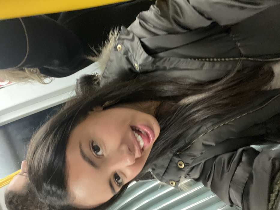 A young woman with long, dark hair poses for a selfie indoors, possibly on public transportation