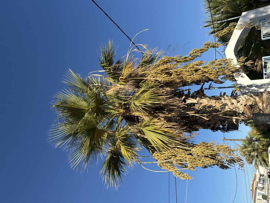 - "The image displays a large fan palm tree in Megalochori, Greece, captured from a low-angle perspective against a clear, bright blue sky" by FM-jXUQf2, licensed under CC BY 4.0