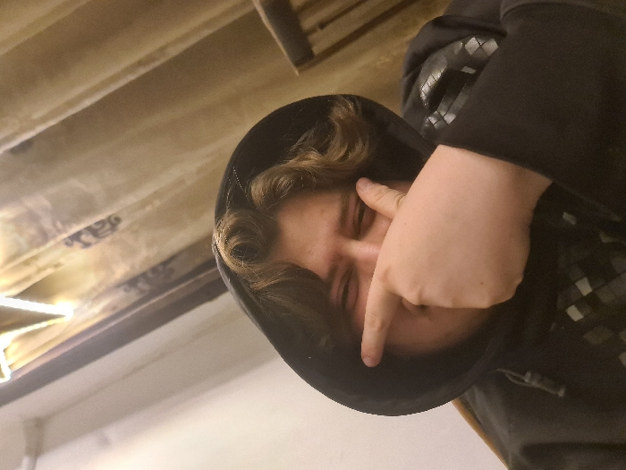 A person wearing a dark hoodie is displayed at an angle. Their face is partially obscured by their hand, held in a "peace sign" gesture over their eyes. The individual has curly hair peeking out from under the hood. The background appears to be a ceiling with beams or slats, possibly a basement or attic space. The lighting is somewhat dim.