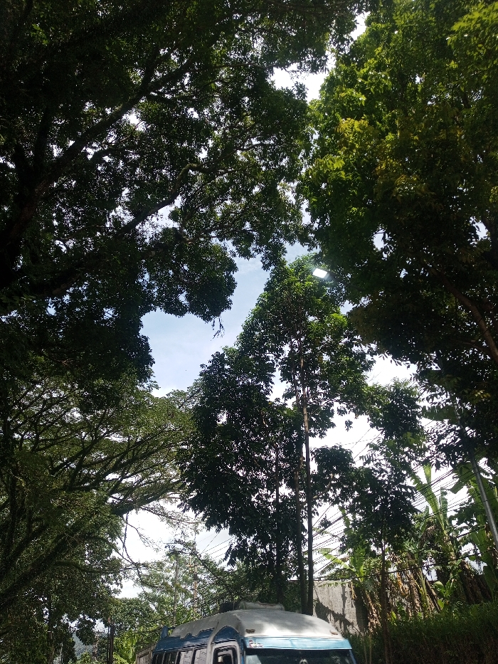A view upwards showcases a dense canopy of trees, with varying shades of green foliage partially obscuring a bright sky. Sunlight filters through gaps in the leaves. The base of the frame features a blue and grey vehicle, possibly a bus, partially concealed by the foliage. A wall and some bananas trees are also visible in the background.