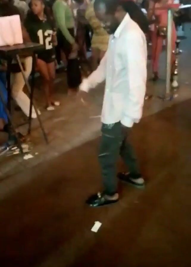 man dancing in a dimly lit outdoor setting, possibly a street or outdoor venue. He is wearing a light-colored long-sleeved shirt, dark jeans, and black shoes. He has a beard and appears to be enjoying himself. In the background, there are other people milling around, some standing and watching, others possibly dancing as well. There is also what appears to be a folding table with items on it to the left of the man. The ground is paved and there is litter visible. The lighting suggests it might be nighttime. The quality of the video is somewhat grainy.